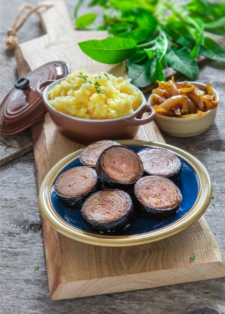 5. Disposez votre purée, vos tranches d'andouilles et le confit d'oignons et savourez !